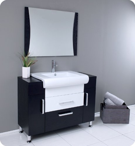 Post Modern detailed European design meets Tribeca loft clean and simple lines. Almost 1950s industrial in look, fully functional 21st in design. This mostly dark venge wood vanity utilizes cleverly constructed and executed storage spaces that contrast wonderfully with a white sink and white middle drawer.Mirror with matching dark wood accents.