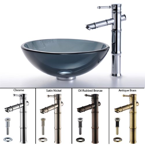 Finish:Chrome, Glass Options:Clear Glass The Kraus 12mm thick Black Glass Vessel Sink & Bamboo Faucet combination is both stylish & exquisite.It will turn an ordinary bathroom into a lavish & trendy space. Clear glass vessel sink creates a perfect harmony of elegance & modern design. Faucet constructed from solid brass. High quality ceramic cartridge ensures years of trouble free service. Designed for above counter installation. Single-hole, faucet installation. Standard US plumbing connections. Kraus solid brass umbrella pop-up drain. All mounting hardware & hot/cold waterlines are included. Combination includes: vessel sink, Bamboo faucet with a matching glass, pop-up drain & mounting ring.