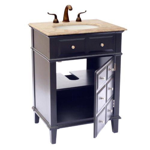 - Single vanity with black finish, Brushed nickel hardware, Travertine stone countertop, Undermount ivory ceramic basin