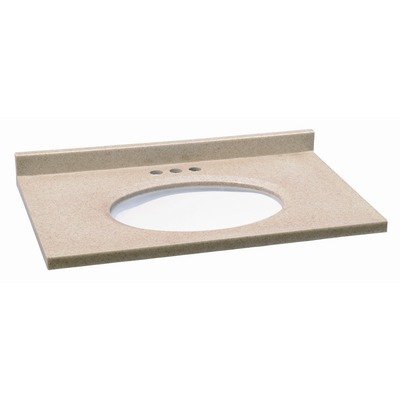 553164 Features: -Bathroom vanity.-White undermount ceramic oval bowl with overflow cUPC certified.-Pre-drilled on center, 3 hole for 4" faucets.-2" integrated backsplash.-Side splashes sold separately.-Drip free edge profile.-Faucet not included with the vanity top.-Product dimensions are: 31" W x 19" D.