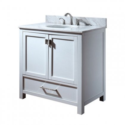 MODERO-VS36-WT-A Top Finish: Natural Black Granite Features: -Bathroom vanity.-2 Soft close doors.-1 Soft close drawer.-Top pre-drilled for 8" widespread faucet.-White vitreous china under mount sink.-Adjustable height levelers. Construction: -Poplar solid wood and veneer construction. Color/Finish: -White finish.-Brushed nickel finished hardware. Dimensions: -Overall dimensions: 35" H x 37" W x 22" D. Collection: -Modero collection.