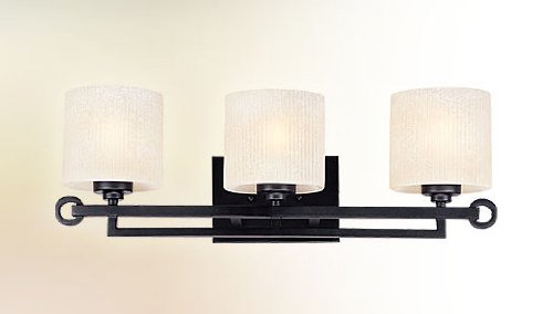 Traditional Bath Vanity Light in Iron with Light Amber glass from the Telluride Collection by Troy Lighting. Dimensions: 8.00 H 24.00 W 5.75 E