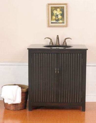 Suitable for many types of decor, the Vienne single sink bathroom vanity is simple but elegant. Its compact size makes it ideal for any small bath or powder room. Black in color with cherry highlights, the cabinet features a unique design pattern of vertical lines that follow polished edges, a flat front, and block feet. Two doors with antique brass pulls conceal a dividing shelf and spacious interior. Above is a gleaming black galaxy granite countertop and undermount ivory ceramic sink. Three holes are pre-drilled for any standard 8-Inch widespread faucet (sold separately). Handmade by skilled and experienced craftsmen, the fully assembled cabinet has a solid birch frame. Sides and panels are wood composite featuring a grade A veneer finish that presents a natural wood look and feel.
