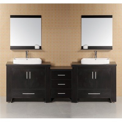 DEC083-E Features: -Water resistant wood countertop.-Rectangular white porcelain vessel sinks.-Polished chrome pop up drain.-Five drawers and two double cabinet.-Matching framed mirror.-Removable side towel bar.-Faucets not included. Construction: -Solid oak wood construction. Color/Finish: -Satin nickel finish hardware. Dimensions: -Overall dimensions: 34" H x 88" W x 22" D. Collection: -Washington collection.