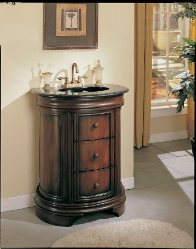 This Tayside collection sink with black granite top is made of solid wood, medium density fiberboard, black granite and black porcelain. Faucet spread with brass 1001, tote drainage spread with brass, no marble backsplash. Sink measures 28-inch length by 21-inch width by 36-inch height. Made in China. This product weighs 132-pound.
