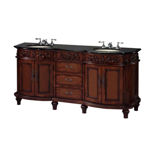 Get the look of antique furniture at a fraction of the price with our Chelsea Double Sink Cabinet. This bathroom vanity features plenty of drawer and cabinet space for your bath necessities. With beautiful, intricate details, this sink cabinet will add a touch of elegance to any bathroom. Order now to enhance your bath decor.A beautiful 3/4-inch thick hand-polished granite top adds classic style.Handcrafted with exquisite carved detailing.Ivory sink basins included.Find more designs in our double sink cabinets.Find the perfect faucet to complete your new bath vanity at The Home Depot Actual size is BLACK GRANITE