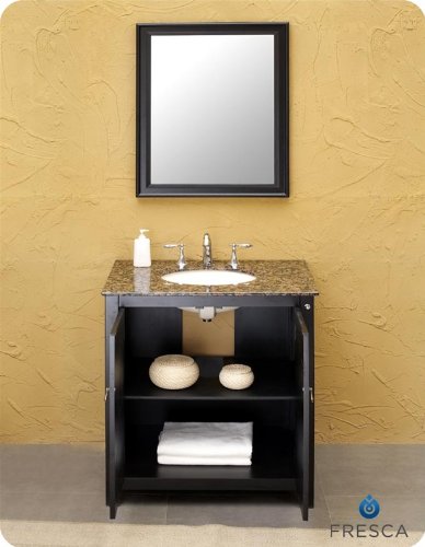 The Fresca Lynx Classic Single Sink Bathroom Vanity has wide appeal for a small bath or powder room. The double door panels have vertical lines crafted into a solid Aspen wood frame. The traditional black wood finish pairs well with antique hardware and your choice of either flecked Baltic brown or solid black galaxy granite countertops. Storage-wise, this bathroom vanity provides two interior shelves for towels and necessities. Choose the Lynx Classic Mirror for a matched set (sold separately).