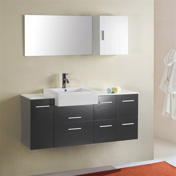 UM-3055 Features: -Single bathroom vanity set.-Five drawers for plenty of storage, one door storage cabinet on left side.-Elegant wall mirrors side storage cabinet.-Stunning deep bathroom sink.-Mounts directly into wall studs, leaving the area below open and airy.-Vanity features clean lines and a distinctive design with a concealed back drain located behind the basin.-Offers contemporary style to any setting. Construction: -Solid rubberwood construction.-Solid brass construction faucet with pop up drain in chrome. Color/Finish: -Black finish.-Vanity grants the perfect shape and quality finishing demanded of sophisticated applications. Dimensions: -Vanity Cabinet Dimensions: 23.62'' H x 55.12'' W x 14.57'' D.-Sink Dimensions: 6.7'' H x 17.7'' W x 17.7'' D.-Mirror Dimensions: 19.7'' H x 35.4'' W x 0.2'' D.-Mirror Cabinet Dimensions: 19.7'' H x 15.7'' W x 8.7'' D.
