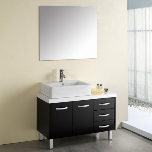 UM-3069 Features: -Single bathroom vanity set.-Stunning three drawers and two door with shelving.-Elegant wall mirrors.-Stunning wash basin.-Pop - up drains.-All hardware needed for installation.-Rubberwood has very little tendency to warp or crack.-Eco friendly. Includes: -Includes faucet. Construction: -Solid rubberwood construction. Color/Finish: -Black finish. Dimensions: -Main cabinet dimensions: 20.9'' H x 39.4'' D x 18.9'' D.-Basin dimensions: 6.3'' H x 18.1'' W x 18.1'' D.-Mirror dimensions: 35.4'' H x 31.5'' W x 0.2'' D.-Overall dimensions: 20.9'' H x 39.4'' W x 18.9'' D.
